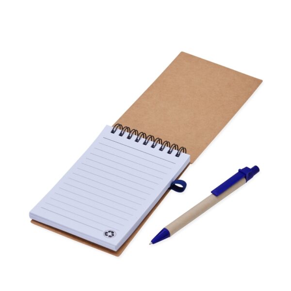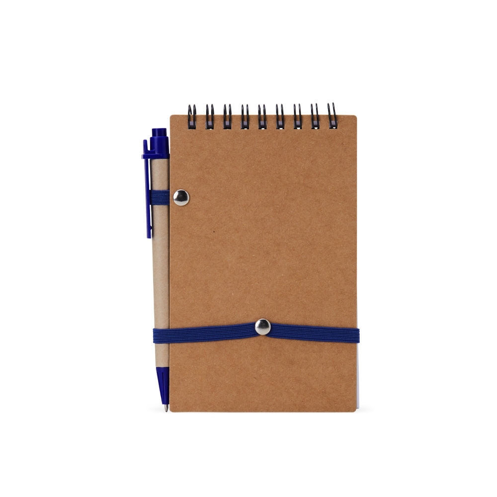Bloco de anotações ecológico com caneta, feito em kraft com detalhe plástico. Contém aproximadamente 70 folhas brancas com pauta, porta caneta elástico, elástico para lacre e acompanha caneta de papelão com detalhes plásticos, carga esferográfica azul 1.0mm e acionamento por clique.