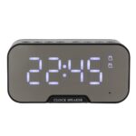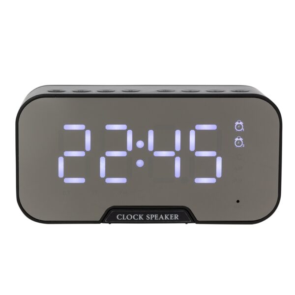 Caixa de som multimídia com relógio despertador e suporte para celular. Produzida em plástico e com borrachas antiderrapantes na área inferior, a caixa de som tem a área frontal espelhada e display de LED, além de um compartimento com suporte para celular – uma espécie de “gaveta” aonde é exibido (CLOCK SPEAKER), basta puxá-la ter acesso ao compartimento. A caixa de som executa nos modos bluetooth, rádio FM, cartão TF-microSD (até 16GB) e entrada auxiliar P2. Acompanha cabo USB e manual em inglês.