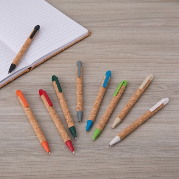 Descrição: Kit ecológico, caneta e lapiseira de cortiça com detalhe em palha de trigo e estojo de kraft. Carga esferográfica azul 1mm e lapiseira 0.7mm com acionamento por clique.