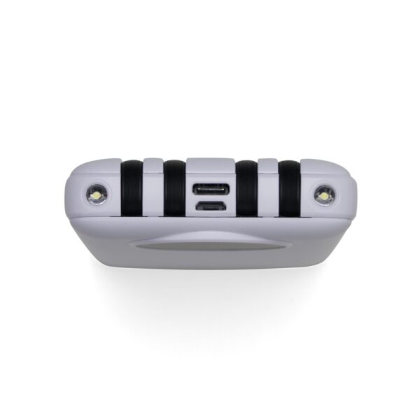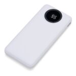 Carregador portátil de 10.000mAh com display digital indicador de bateria, contém duas lanternas de led e quatro cabos de saída acoplados, sendo: saída Lightning, saída Tipo-C, saída V8 e saída USB. O carregador possui uma porta USB dupla (entrada e saída) com carga rápida e outras duas portas de entrada: V8 e Tipo-C. Acompanha cabo USB.