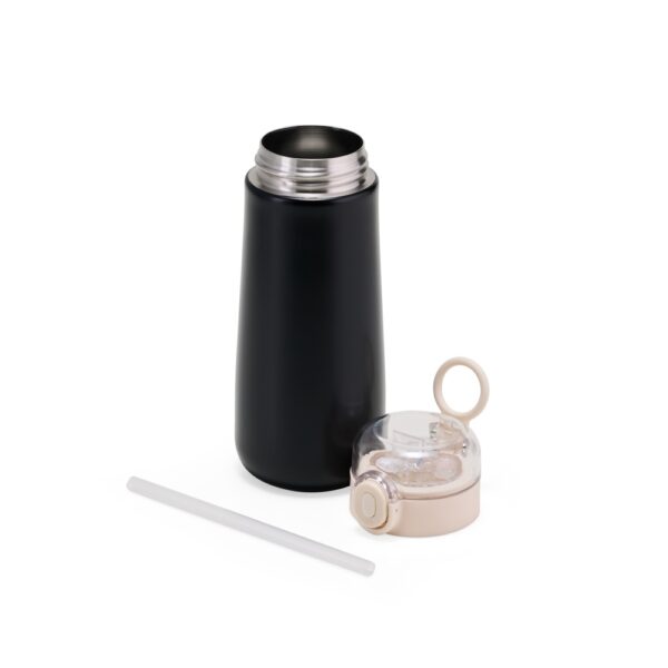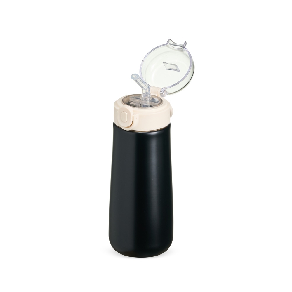 Garrafa Térmica feita em Inox 304, capacidade 500ml. Tampa rosqueável com botão de acionamento para abrir a tampa protetora do bocal. Acompanha bico de silicone e canudo plástico.