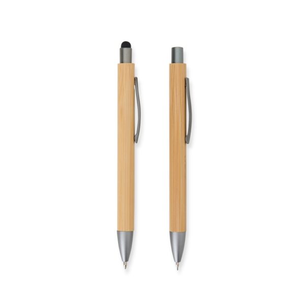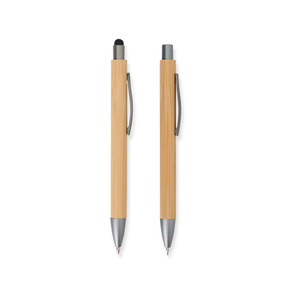 Descrição: Nosso Kit Ecológico de Caneta e Lapiseira de Bambu é excelente para quem busca um toque sustentável no dia a dia. A lapiseira possui acionamento por clique, e a caneta conta com carga esferográfica azul de 1.0mm e função touch para quem precisa de toques precisos em dispositivos. Além disso, acompanha uma embalagem que imita bambu. Uma ótima escolha para presentes corporativos ou para quem ama escrever sem abrir mão da consciência ecológica!