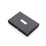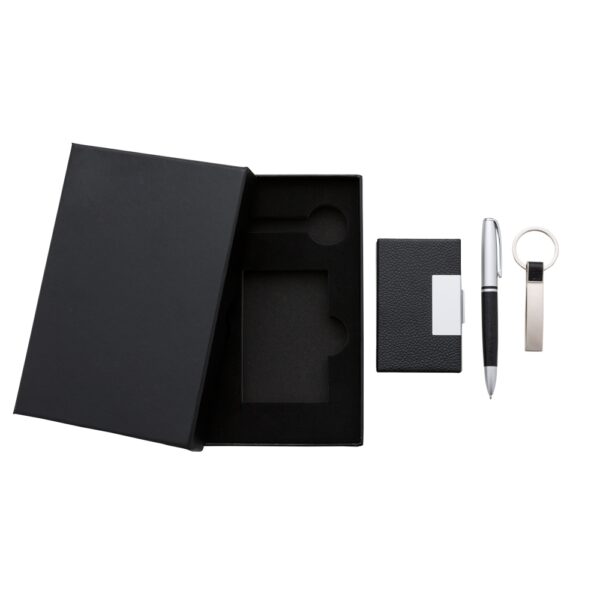 Descrição: Kit executivo 3 peças em estojo de papelão com tampa e parte interna revestida de espuma. Contém: chaveiro metal fosco com detalhe emborrachado preto, porta cartão de couro sintético(verso metálico liso) com placa de metal e caneta metal fosca com detalhe emborrachado preto. Acompanha placa metálica para gravação.