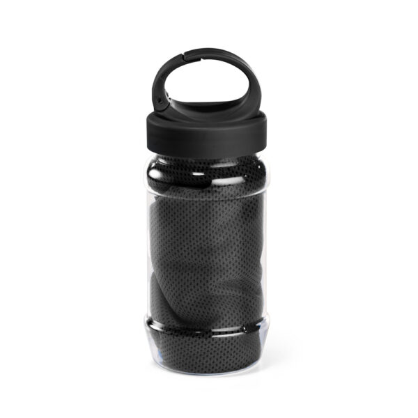 Kit toalha e garrafa. Toalha para esporte em poliamida e poliéster. Toalha refrescante, quando molhada permanece fria durante horas. Se aquecer, basta balançar reativando sua frescura. Reutilizável e lavável à máquina. Garrafa em PP e PET com mosquetão incluso. Capacidade até 440 mL. Caixa branca 94653 vendida opcionalmente. Certificação EU Food Grade. Toalha: 300 x 800 mm | Garrafa: ø65 x 183 mm