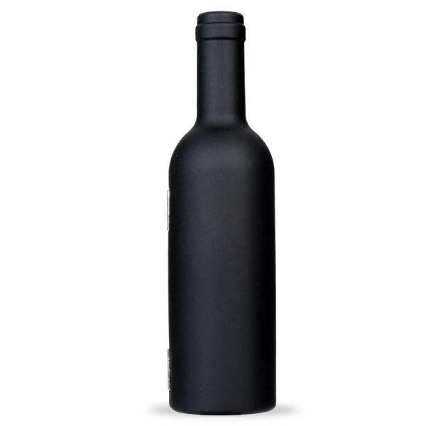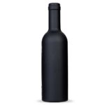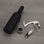 Descrição: Kit vinho formato garrafa com 3 peças: wine collar, bico condutor com tampa e saca-rolhas metálico com lâmina de corte e abridor de garrafa. Estojo com fechamento imantado e área interna com berço de espuma.