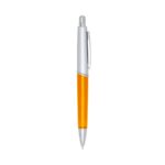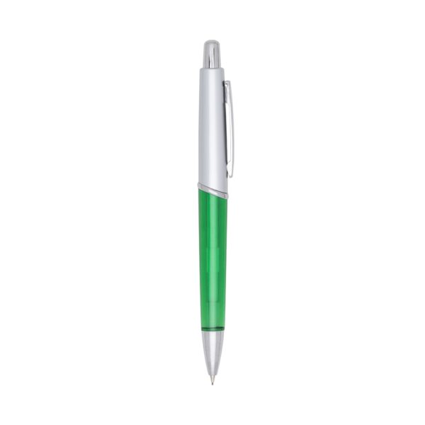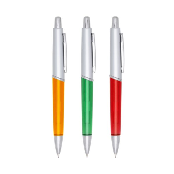 Lapiseira plástica prata com detalhes coloridos translúcidos. Clip de metal, aciona por clique.