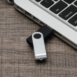 Pen drive de metal giratório 4GB/8GB/16GB/32GB, parte interna preta em plástico resistente. Possui uma “argola” na parte em metal que poderá ser utilizado para colocar algum cordão.