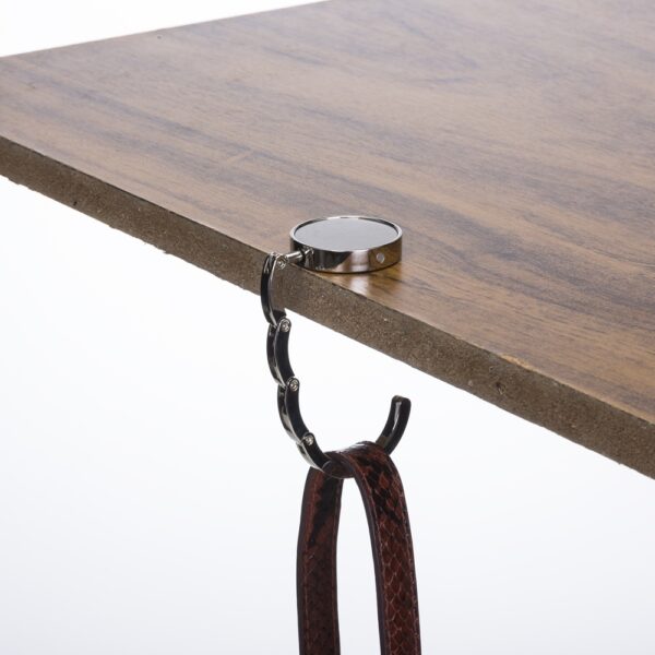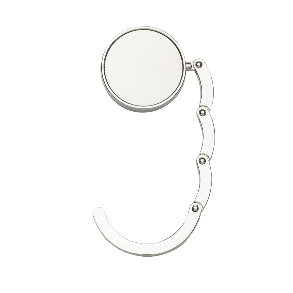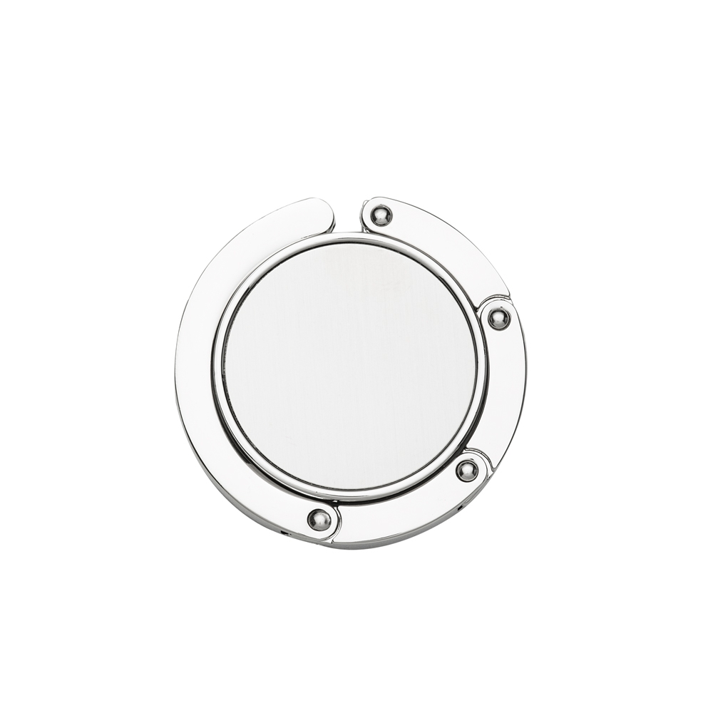 Porta bolsa de metal dobrável, possui chapa central redonda para gravação e parte traseira borracha anti deslizante. Para utilizar o porta bolsa basta puxar a lateral(é imantado) e abri-lo.